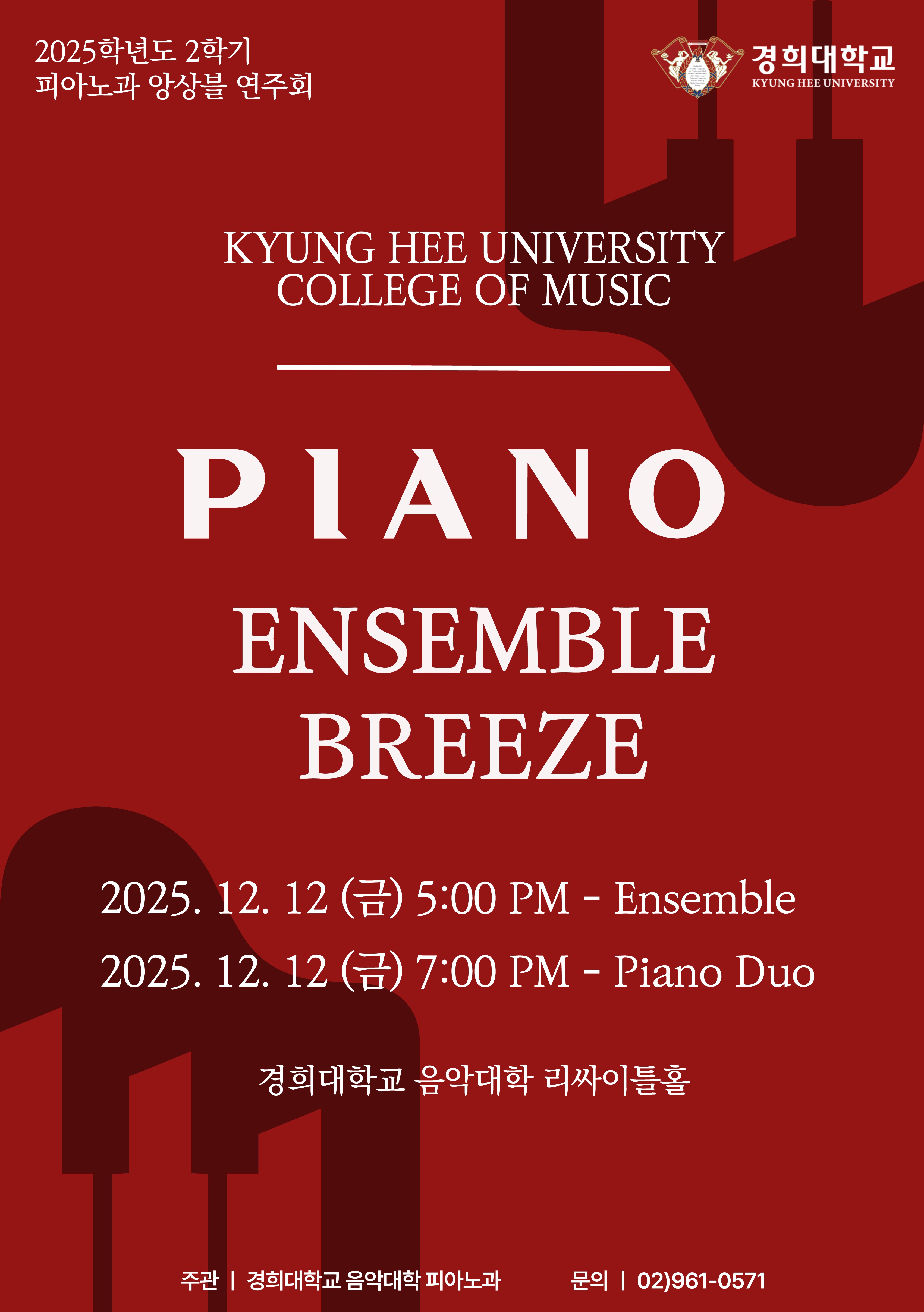 음악대학 기악과(피아노)에서는 2025학년도 2학기 앙상블 콘서트 [Piano Ensemble Breeze]를 아래와 같이 개최합니다.