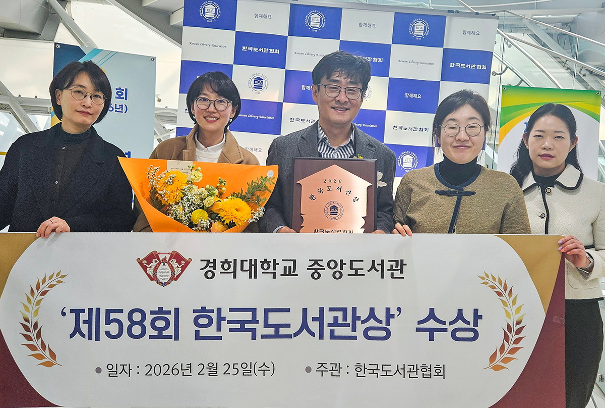 중앙도서관이 ‘제58회 한국도서관상’의 단체상을 수상했다. 이 상은 국내 도서관 발전에 기여한 기관(단체)과 개인에게 수여되는 상이다. 도서관 분야에서는 최고 권위의 상으로 알려져 있다. 중앙도서관은 이번 수상으로 도서관 운영 혁신과 교육·연구 지원 서비스 고도화, 대학도서관 발전·협력 거버넌스 활동을 통해 대학도서관의 역할을 확장해 온 성과를 인정받았다. 시상식은 지난 2월 말 열린 제77차 한국도서관협회 정기총회에서 진행됐는데, 경희대는 4년제 종합대학(단체상) 중 유일한 수상 기관이었다.