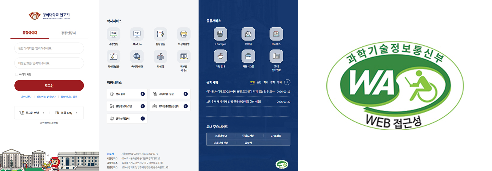 국내 대학 가운데 학사정보시스템, 포털시스템을 대상으로 웹 접근성 인증을 취득한 기관은 많지 않다. 경희는 그간 일반대학원 홈페이지와 서울·국제캠퍼스 장애학생지원센터 홈페이지 등 총 3개 홈페이지에서 웹 접근성 인증을 받았으며 학생 포털은 2025년 3월 최초로 웹 접근성 인증을 획득했다. 이후 지난 3월 교직원 포털이 새롭게 인증을 취득하며 전 구성원이 편리하고 동등하게 이용할 포털 환경을 마련했다.