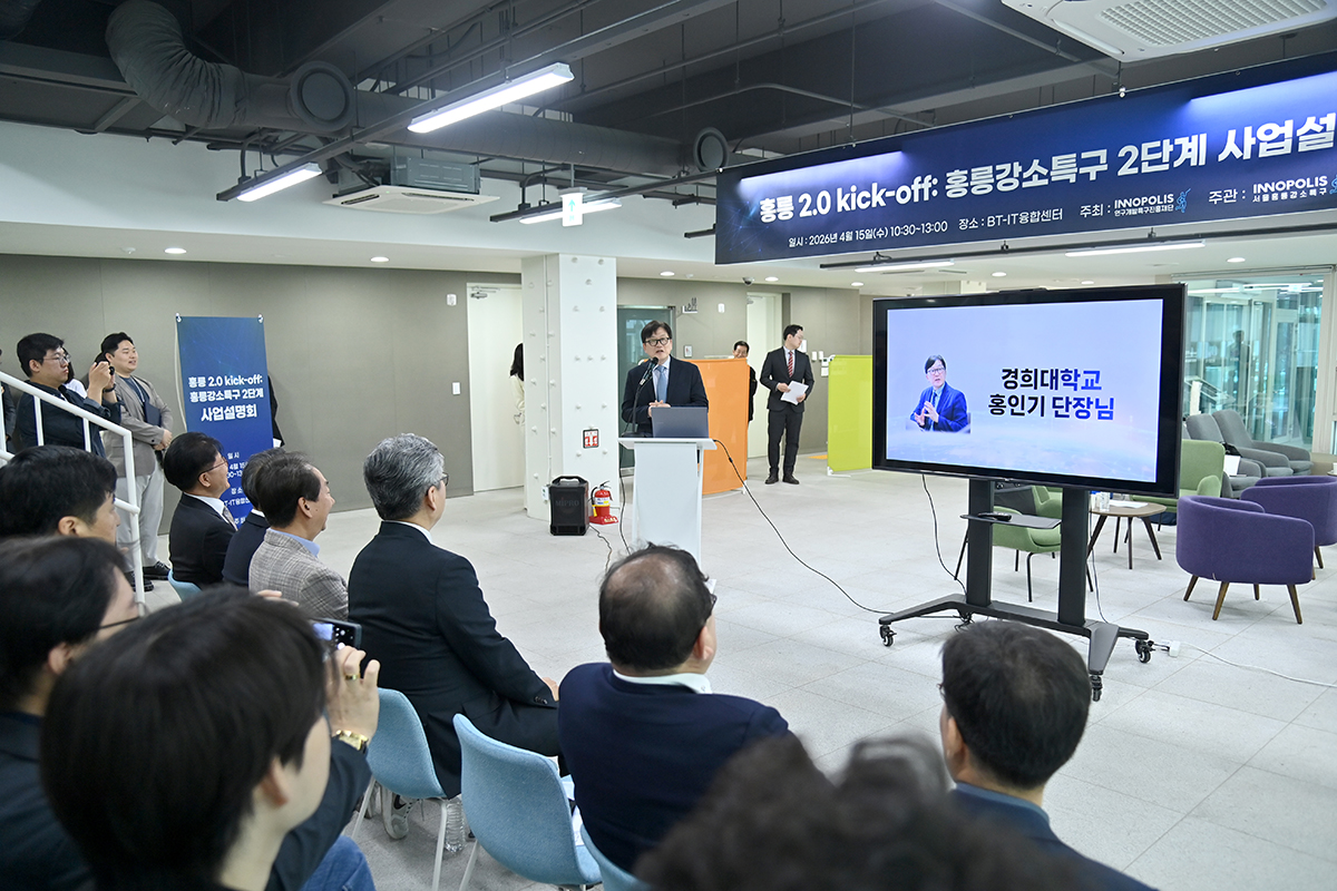 경희대가 참여하고 있는 ‘홍릉 강소연구개발특구(이하 홍릉 강소특구)’ 사업의 2단계 사업이 본격 시작을 알렸다. 홍릉강소특구사업단이 4월 15일(수) 서울바이오허브 BT-IT융합센터 1층에서 강소특구 입주기업과 예비 창업자 등을 대상으로 개최한 ‘홍릉 2.0 Kick-off: 홍릉강소특구 2단계 사업설명회’를 통해서다. 사업설명회에는 각 기관을 대표하는 관계자들이 참여했다. 경희대에서는 산학협력단의 홍인기 단장과 의무산학협력단의 윤경식 단장과 더불어 KIST 오상록 원장, 고려대 김학준 의학연구처장, 서울바이오허브 김현우 단장, 홍릉강소특구사업단 임환 단장, 연구개발특구진행단 이강준 본부장 등 참여 핵심 기관과 사업단 내빈들이 한자리에 모였다.