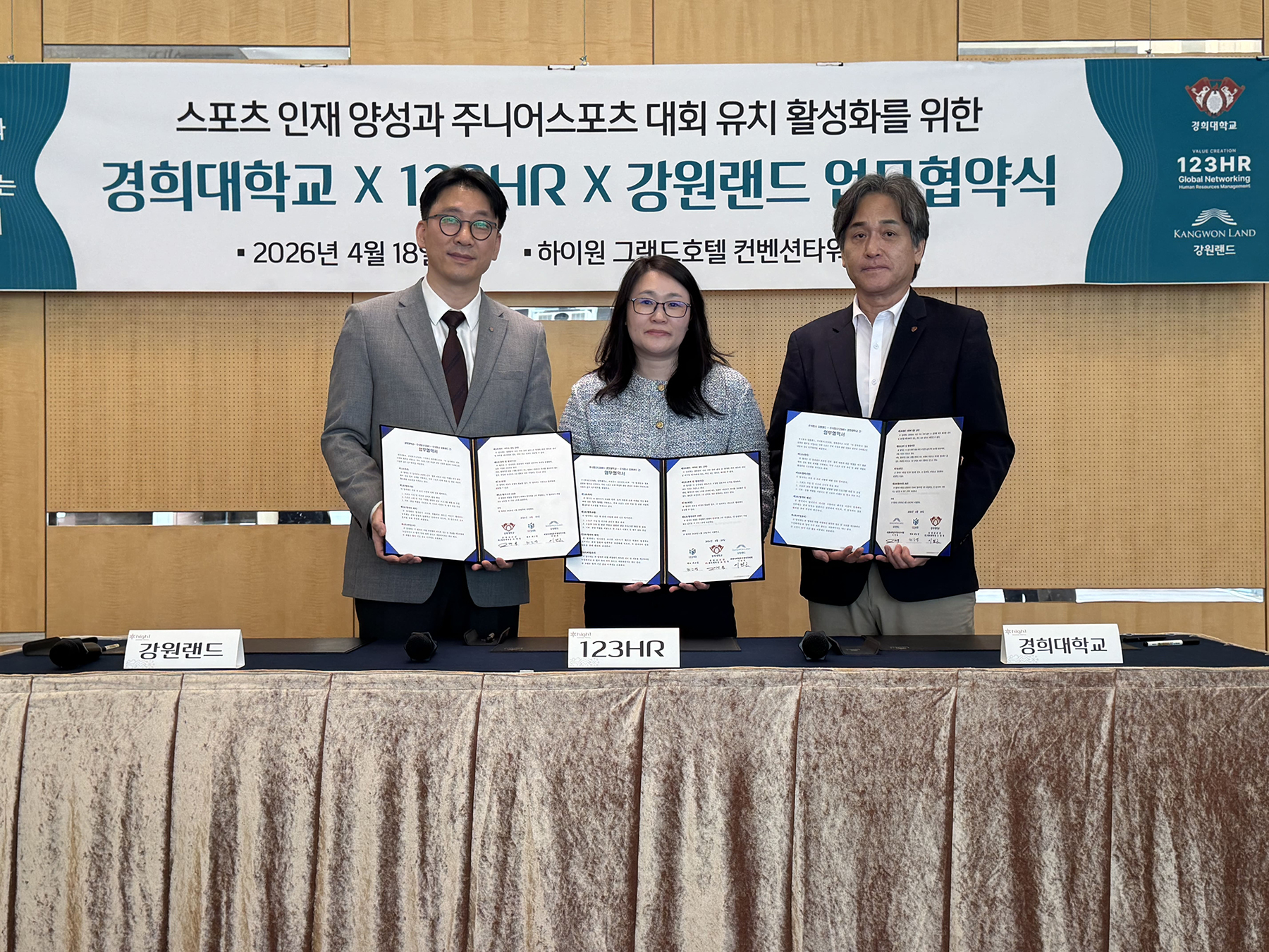 경희대, ㈜강원랜드 그리고 ㈜123HR이 ‘스포츠 인재 육성 및 관련 산업 발전을 위한 3자 간 업무협약’을 지난 4월 18일(토) 하이원 그랜드호텔 컨벤션타워에서 체결했다. 사진 좌측부터 강원랜드 이민호 관광마케팅본부장, 123HR 최소영 대표, 체육대학 오경록 학장.
